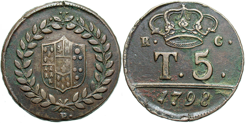 Italian States, Naples. Ferdinando IV. 1798-P RC. 5 tornese (28 mm, 12.88 g). Shield of 6-fold arms, with central shield, in laurel wreath / Large crown above value 'T.5.', date in exergue. KM 222. Good VF.