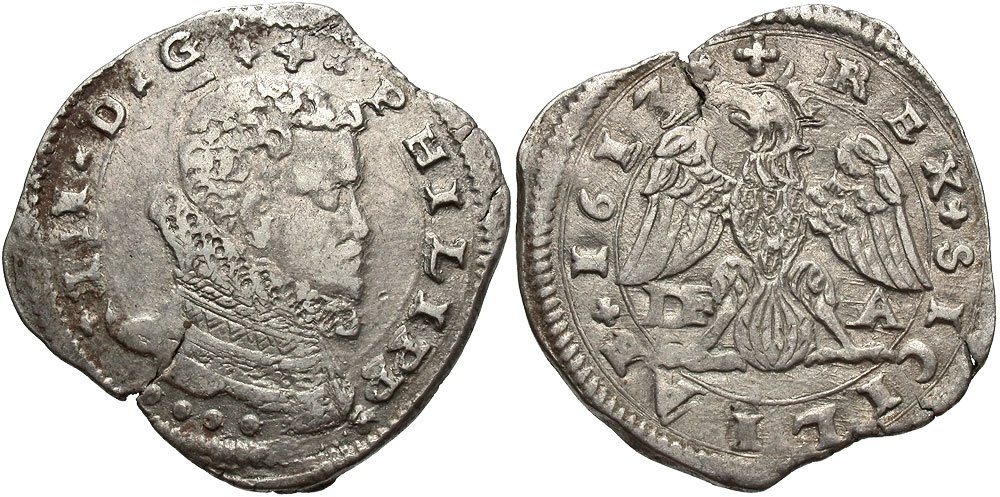 Lot 33-307. Italian States, Sicily. Filippo III of Spain. 1613-DFA. AR 4 tari.