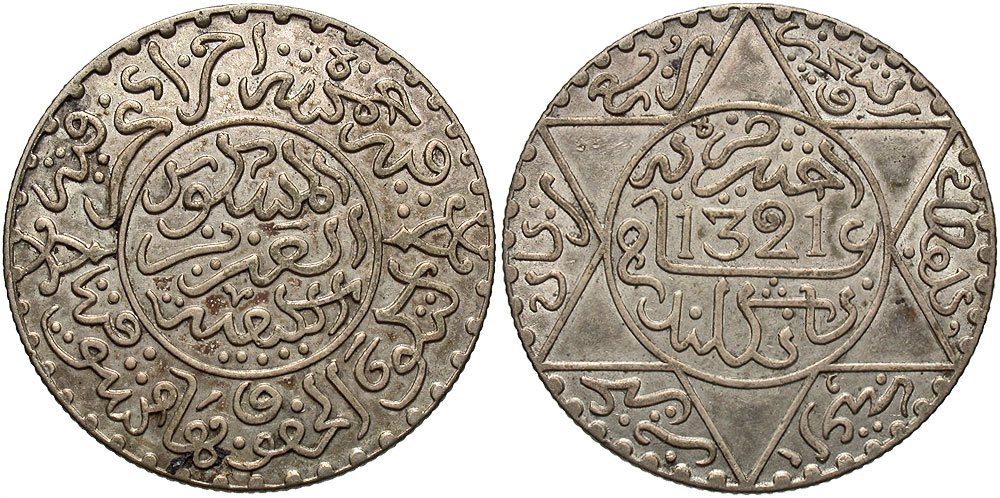 Lot 33-314. Morocco, 'Alawi Sharifs. 'Abd al-'Aziz. A.H. 1321 (1903/4). 1/4 rial. London mint.