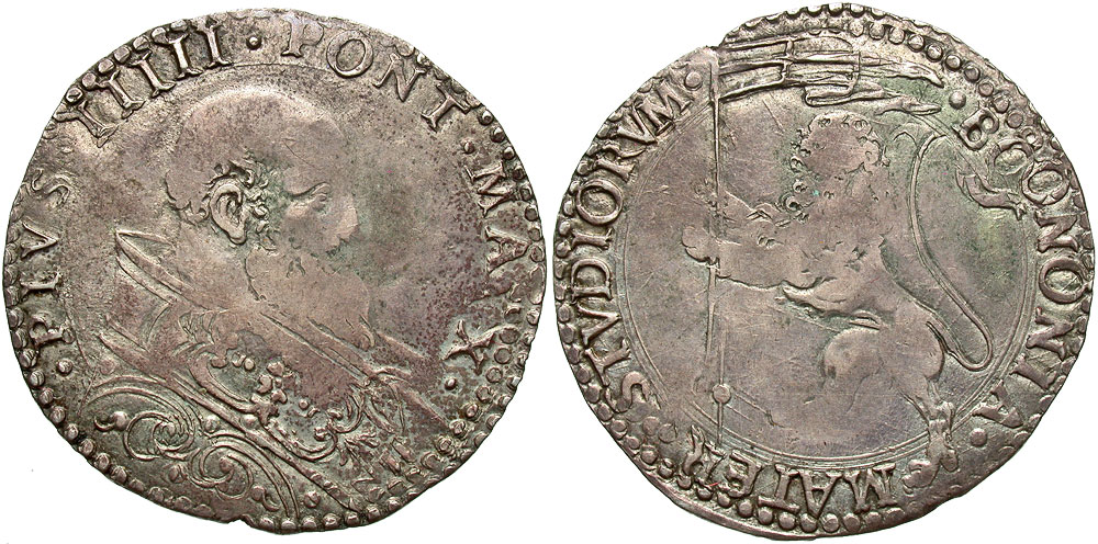 Papal States. St. Pius V. 1566-1572. AR bianco (29 mm, 4.87 g, 6 h). Bologna mint. Bust right / Lion rampant left, holding banner. Berman 1116. Fine, toned.