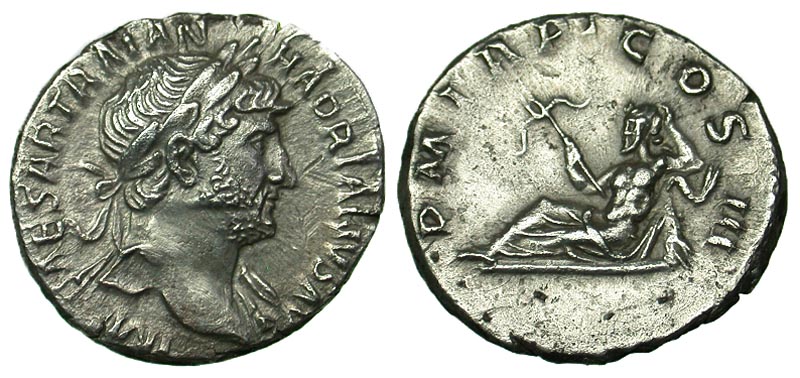 Hadrian. A.D. 117-138. AR denarius (18.4 mm, 3.22 g, 7 h). Rome, A.D. 119-125. IMP CAESAR TRAIAN HADRIANVS AVG, laureate bust right, drapery on left shoulder / P M TR P COS III, Oceanus reclining left on dolphin, holding anchor. RIC 75; RSC 1110. EF, scarce.