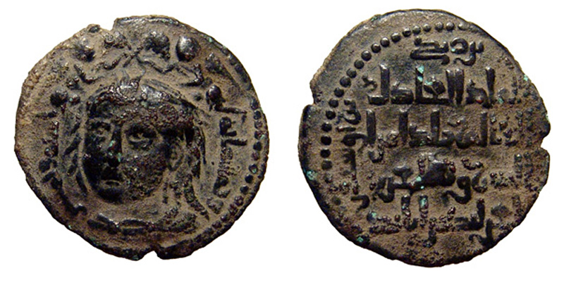 Zengid Atabegs, Mosul. Qutb al-Din Mawdud. 544-565/1149-1170. Æ dirhem (30.5 mm, 14.10 g). 556/1160. Male bust facing slightly left, hair disheveled and prominent knot at forehead; two winged creatures above, wing-tips crossed / Kufic legend containing name and titles of Qutb al-Din Mawdud. S&S 59.2; Butak 70; Mitch 1117-8. aVF.