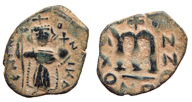 Arab-Byzantine, Syria and Palestine. Standing imperial figure type. 647-ca. 670. Æ fals (23 mm, 3.45 g, 9 h). Syrian or Palestinian mint. Standing figure of Constans II with cross on crown, holding long cross and globus cruciger / Large M, cross above, illegible inscription. VF, nice detail.