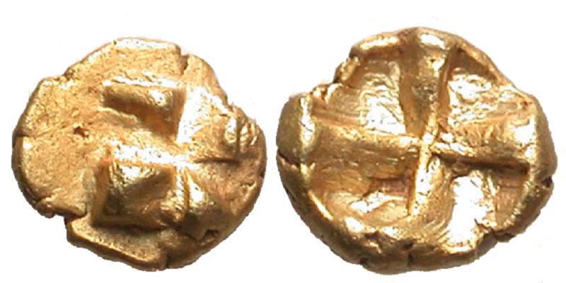 Ionia, Uncertain mint. Ca. 625-600 B.C. EL forty-eighth stater (5.9 mm, 0.73 g). Phokaic standard. Raised clockwise swastika pattern / Quadripartite incuse square. Traité I 238; SNG Kayhan -. VF. Ex CNG.