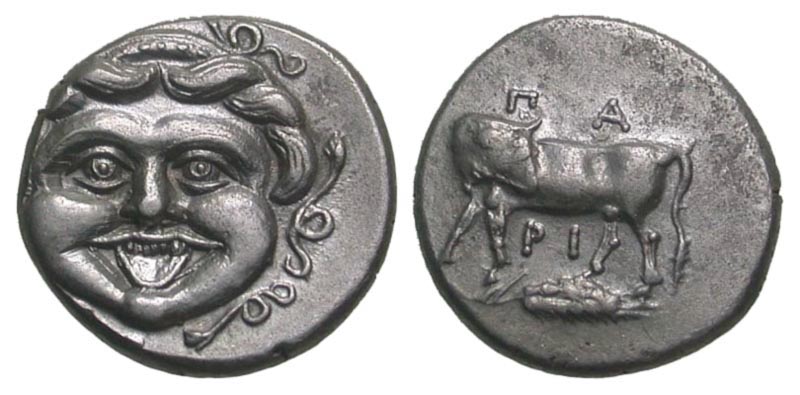Mysia, Parion. 4th century B.C. AR hemidrachm (14.2 mm, 2.34 g, 11 h). Facing gorgoneion / ΠA-PI, Cow standing left, head turned right; grain below. BMC 23; SNG France 1373; SNG von Aulock 1320. gVF.