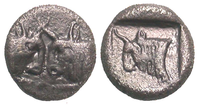 Lot 34-067. Caria, Uncertain mint. 5th century B.C. AR diobol.