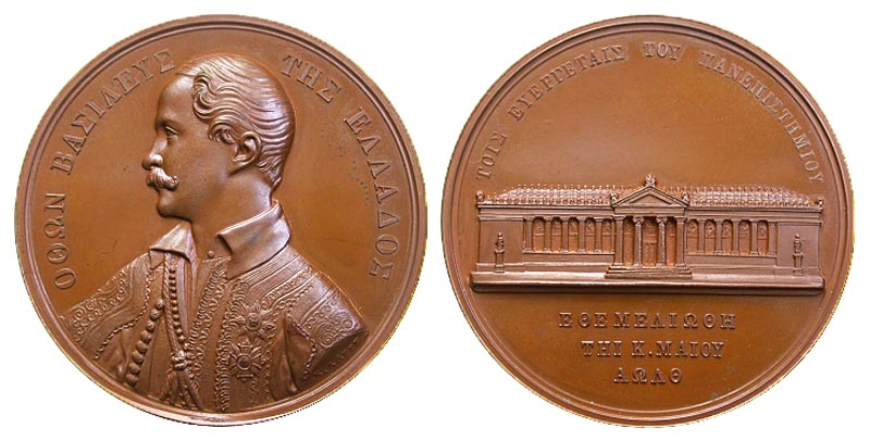 Greece. King Othon. 1816-1857, King 1833-1862. 44.1 mm, 43.53 g, 12 h). 1837. OΘΩN BAΣIΛEYΣ THΣ EΛΛAΔOΣ, bust left in national dress / TOIΣ EYEPΓETAIΣ TOY ΠANEΠIΣTHMIOY / EΘEMEΛIΩΘH THI K.MAIOY AΩΛΘ, university facade. EF, minor field marks.