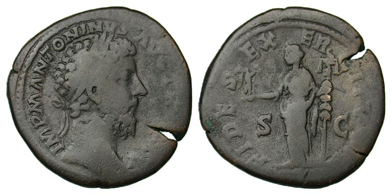 Marcus Aurelius. A.D. 161-180. Æ sestertius (33.0 mm, 20.52 g, 6 h). Rome, A.D. 171. IMP ANTONINVS AVG TR P XXV, laureate head right / FIDES EXERCITVM, S-C, Fides standing left, holding Victory and a legionary standard. RIC 998. aVF, flan crack.
