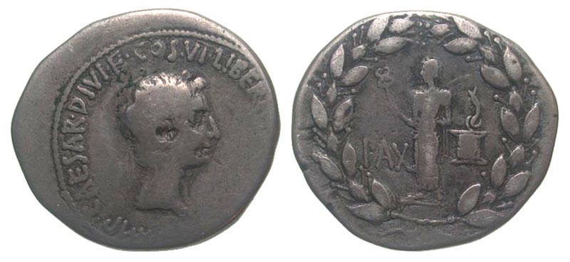 Roman Provincial. Octavian. 44-27 B.C. AR cistophorus (27.3 mm, 10.87 g, 12 h). Ephesus mint. IMP CAESAR · DIVI · F COS VI · LIBERTATIS P · R · VINDEX ·, laureate head right / PAX, Pax standing left, holding caduceus; to right, serpent arising from cista mystica; all within laurel wreath. RPC 2203; RIC 473; RSC 218. Fine, scratches.