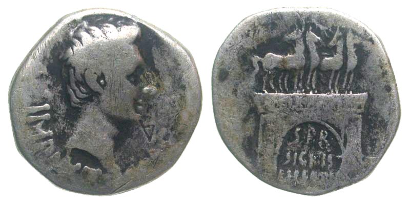 Roman Provincial. Augustus. 27 B.C.-A.D. 14 AR cistophorus (26.2 mm, 10.91 g, 11 h). Pergamum mint, Struck A.D. 18-19. IMP · IX · TR · POV, bare head right / IMP · IX · TR · POT · V · above archway, S · P · R ·/SIGNIS/RECEPTIS, Triumphal Arch of Augustus, surmounted by charioteer in facing quadriga; an aquila before each side wall. RPC 2218; RIC 510; RSC 298. Toned Fine, scratches.