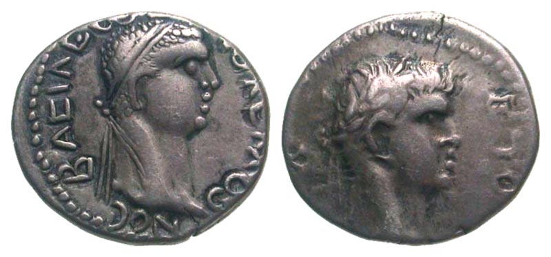 Bosporan Kingdom. Polemo II. A.D. 38-64. AR drachm (17.2 mm, 3.63 g, 6 h). BACIΛЄWC ΠOΛЄMWNOΣ, diademed head of Polemon right / ЄTOYC K, laureate head of Nero right. RPC 3832. VF.