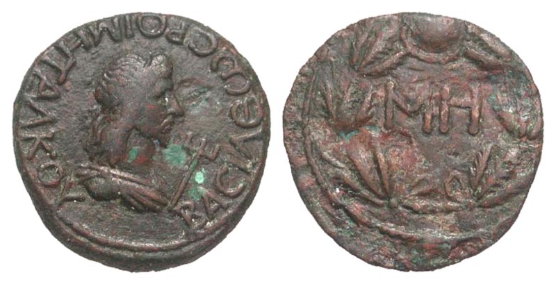 Bosporan Kingdom. Rhoemetalces. A.D. 131/2-153/4. Æ sestertius (24.1 mm, 9.46 g, 12 h). BAΣIΛEΩΣ POIMHTAΛKOY, diademed and draped bust right, trident before / MH within laurel wreath. MacDonald 454; BMC 9. VF.
