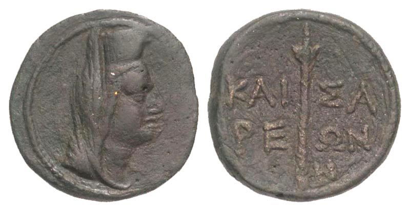 Cimmerian Bosporus, Panticapaeum (as Caesarea). Roman Administration. Ca. 14-12 B.C. Æ 8 units (21.5 mm, 7.98 g, 1 h). Veiled and draped bust of Aphrodite Apatura right, wearing kalathos / KAI-ΣA/PE-ΩN, scepter terminating in pomegranate flower; ·- H at base. MacDonald 274/2; RPC 1936; Anokhin 322. Fine.