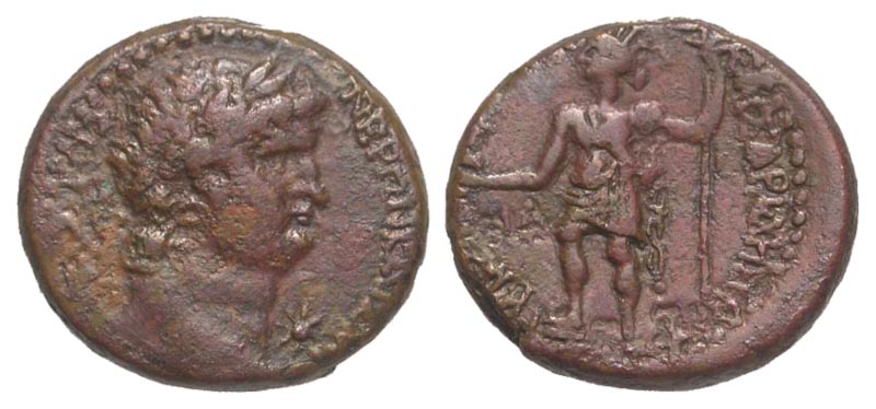 Samaria, Caesarea Maritima. Nero. A.D. 54-68. Æ 22 (23.4 mm, 11.3 g, 114 h). Dated RY 14 = A.D. 68. Scarce. NEPΩN KAIΣAP ΣEBAΣTOΣ, laureate head right, star below chin / KAIΣAPIA H ΠPOS ΣEBAΣTΩ ΛIMENI, Tyche standing left, with foot on prow, holding bust and scepter; L IΔ to left. RPC 4862; SNG ANS 753; Rosenberger 3. VF.