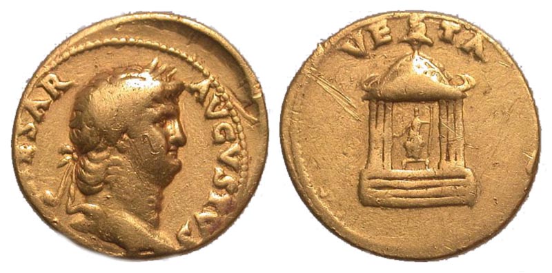 Nero. A.D. 54-68. AV aureus (18.4 mm, 6.40 g, 7 h). Rome mint, Struck A.D. 65-66. NERO CAESAR AVGVSTVS, laureate head right / VESTA, Vesta, holding patera and long scepter, seated within domed hexastyle temple with three steps. RIC 61; BMCRE 103. aVF.