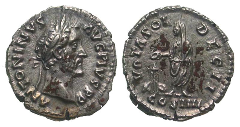 Lot 34-182. Antoninus Pius. A.D. 138-161. AR denarius. Rome mint, Struck A.D. 158-159. Scarce.