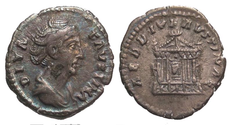 Diva Faustina I. Died A.D. 140/1. AR denarius (18.5 mm, 2.90 g, 5 h). Rome mint, Dated A.D. 150. FAVSTINA AVGVSTA, draped bust right / AED DIV FAVSTINAE, hexastyle temple with statue of Faustina within. RIC 343; RSC 1; BMCRE 339. Toned VF.