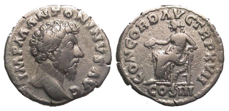 Marcus Aurelius. A.D. 161-180. AR denarius (18.0 mm, 2.94 g, 1 h). Rome mint, Struck A.D. 162-163. IMP M ANTONINVS AVG, laureate head right / CONCORD AVG TR P XVII, COS III, Concordia seated left, holding patera; cornucopia under seat. RIC 59; BMCRE 209; RSC 37. VF.