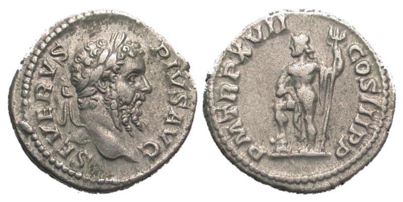 Septimius Severus. A.D. 193-211. AR denarius (18.6 mm, 3.29 g, 12 h). Rome mint, Struck A.D. 209. SEVERVS PIVS AVG, laureate head right / P M TR P XVII COS III P P, Neptune standing left, leaning on raised right leg set on rocks and holding trident. RIC 228; RSC 529. aVF.