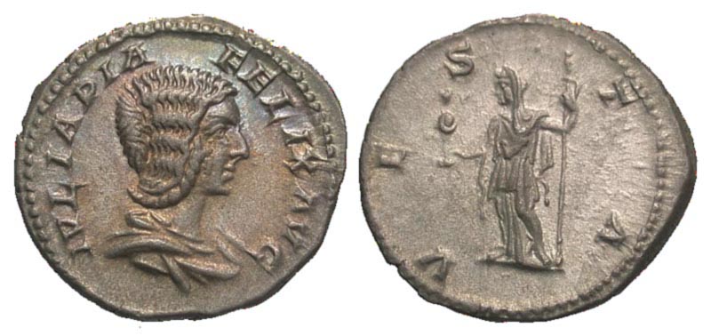 Julia Domna. Augusta, A.D. 193-217. AR denarius (19.2 mm, 3.02 g, 7 h). Rome mint, Struck A.D. 215. IVLIA PIA FELIX AVG, draped bust right / VESTA, Vesta standing left, holding simpulum and scepter. RIC 390; RSC 230. aVF.