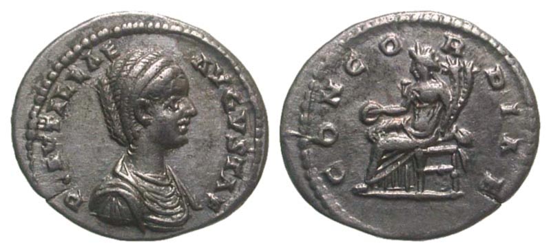Lot 34-215. Plautilla, wife of Caracalla. AD 202-205. AR denarius. Laodicea ad Mar mint, Struck A.D. 202. Scarce.