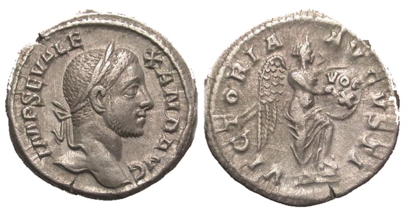 Severus Alexander. A.D. 222-235. AR denarius (18.9 mm, 3.34 g, 12 h). Rome mint, Struck A.D. 230. IMP SEV ALEXAND AVG, laureate head right / VICTORIA AVGVSTI, Victory standing right, with foot on helmet, inscribing VOT/X on shield set on knee. RIC 219; BMCRE 638; RSC 566a. VF.