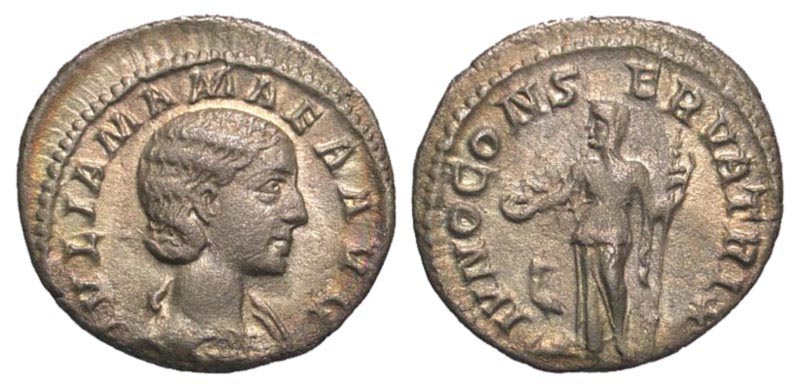 Julia Mamaea. Augusta, A.D. 222-235. AR denarius (19.6 mm, 3.16 g, 1 h). Rome mint, Struck A.D. 222. IVLIA MAMAEA AVG, draped bust right / IVNO CONSERVATRIX, Juno standing left, holding patera and scepter, peacock at feet left. RIC 343 (S Alexander); BMCRE 43 (S Alexander); RSC 35. aVF.