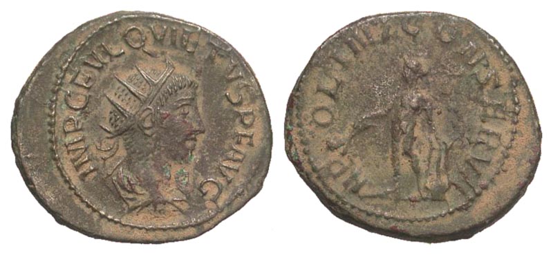 Quietus. Usurper, A.D. 260-261. AR antoninianus (22.9 mm, 4.65 g, 12 h). Antioch mint. IMP C FVL QVIETVS P F AVG, radiate, draped and cuirassed bust right / APOLINI CONSERVA, Apollo standing left, holding laurel branch, left hand on lyre. RIC 3; RSC 3. aVF, sandy patina.