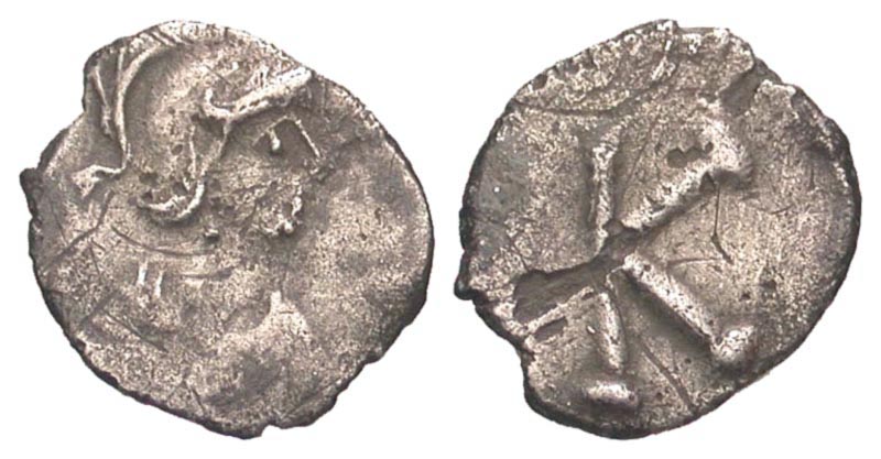 Anonymous. Time of Justinian I, 527-565. AR half siliqua (11.6 mm, 0.41 g, 6 h). Constantinople mint. Helmeted and draped bust of Constantinopolis right / Large K. Bendall 8b; SBV -; DOC -. aVF, toned.