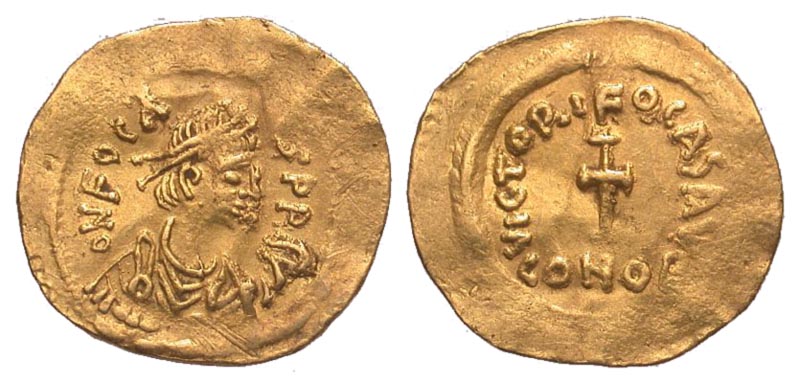 Phocas. 602-610. AV tremissis (17.6 mm, 1.41 g, 6 h). Constantinople mint, Struck 603-607. dN FOCAS PP AVG, pearl-diademed, draped, and cuirassed bust right / VICTORI FOCAS AVG, Cross potent, CONOB in exergue. SBV 633; DOC 18. VF, wavy flan.