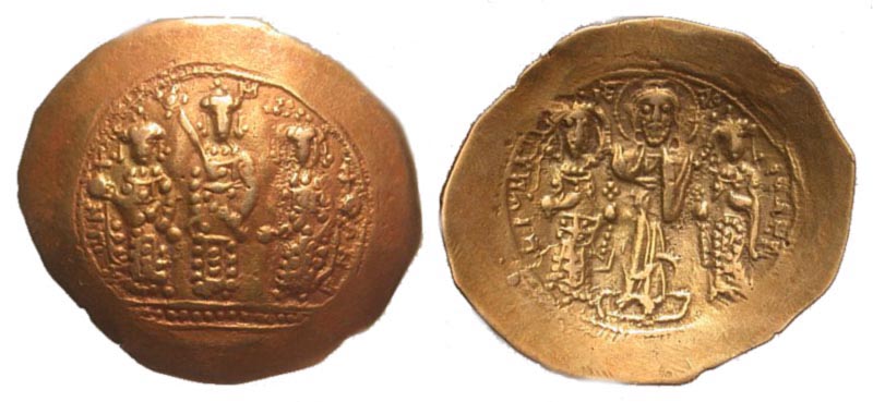 Romanus IV Diogenes. 1068-1071. AV Histamenon Nomisma (26.9 mm, 3.46 g, 6 h). Constantinople mint. KωN MX ANΔ, Michael standing facing, wearing crown and holding labarum and akakia; to left and right, Constantius and Andronicus standing facing, both wearing crown and holding globus cruciger; pelleted band below / + IωMA ЄVΔKAVI, IC XC, Christ standing facing on footstool, wearing nimbus crown and crowning Romanus and Eudocia to left and right, both wearing crown and holding globus cruciger. SBV 1861; DOC 2. gVF, sharp strike.