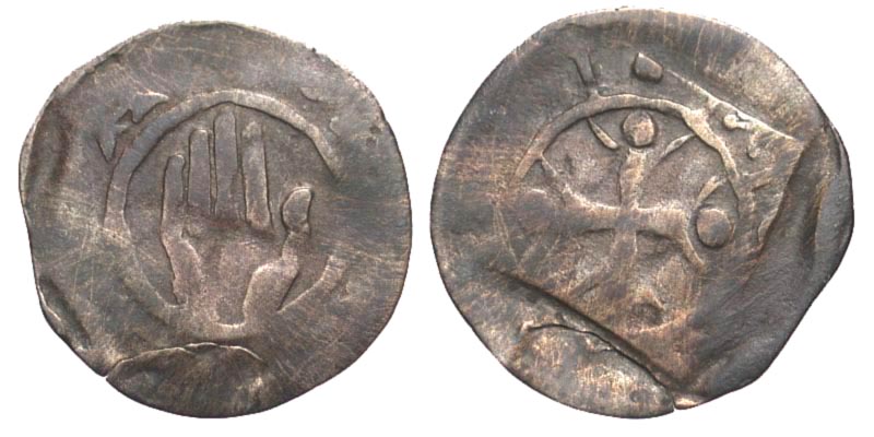 Germany, Hall. 14th century AR heller (17.1 mm, 0.46 g). Hand with palm forward / Cross with arms ending in pellets, all within circular border. Saurma 1364. VF, toned.