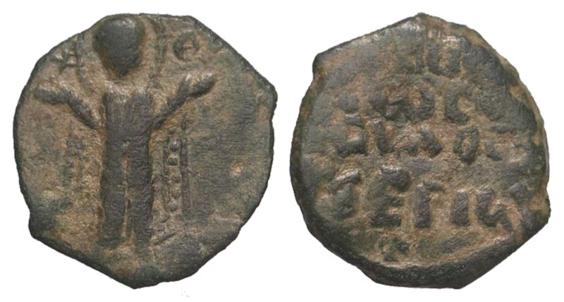 Crusader States, Antioch. Roger of Salerno. Regent 1112-1119. Æ follis (19.9 mm, 2.79 g, 6 h). Second type. Scarce. MP ΘV, Theotokos, orans, standing facing, raising both hands / KE/BOHΘEI Tω/Cω ΔOVΛ/OPΛTΓΕ/PIω, in four lines across field. Metcalf 89-94; CCS 8. aVF, attractive red highlights.
