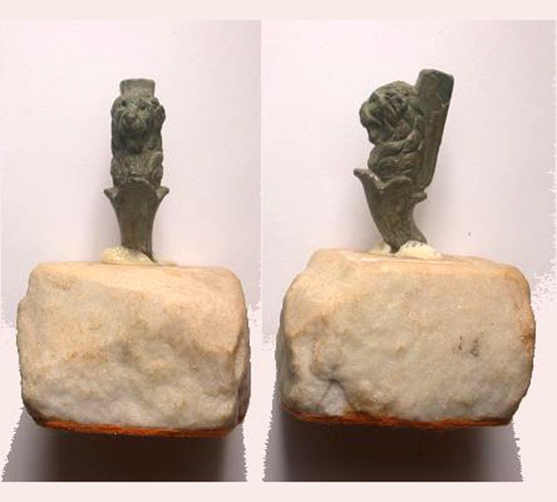 Etruscan Lion Head, 4th-3rd Century B.C. A beautifully cast bronze lion's head, mounted on a marble base. 42 x 14 mm.