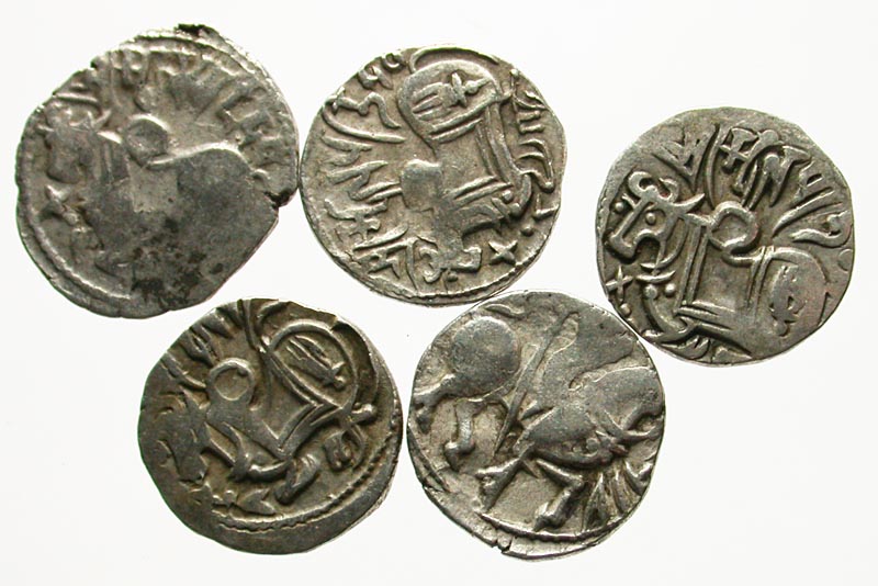 Lot of 5 Shahi Kings AR Coins. Spalapati, 9th century A.D. Recumbant bull / Horseman riding right. Fine. Different types.