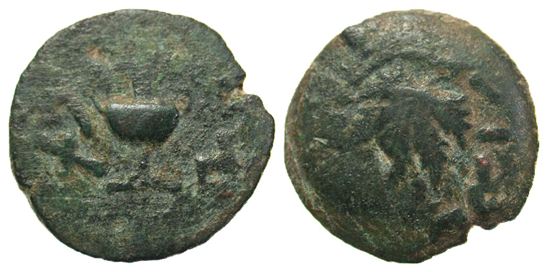 Lot 4-313. Judaea. Jewish War. 66-70 C.E. Æ prutah. Dated year 3 (68/9 C.E.).