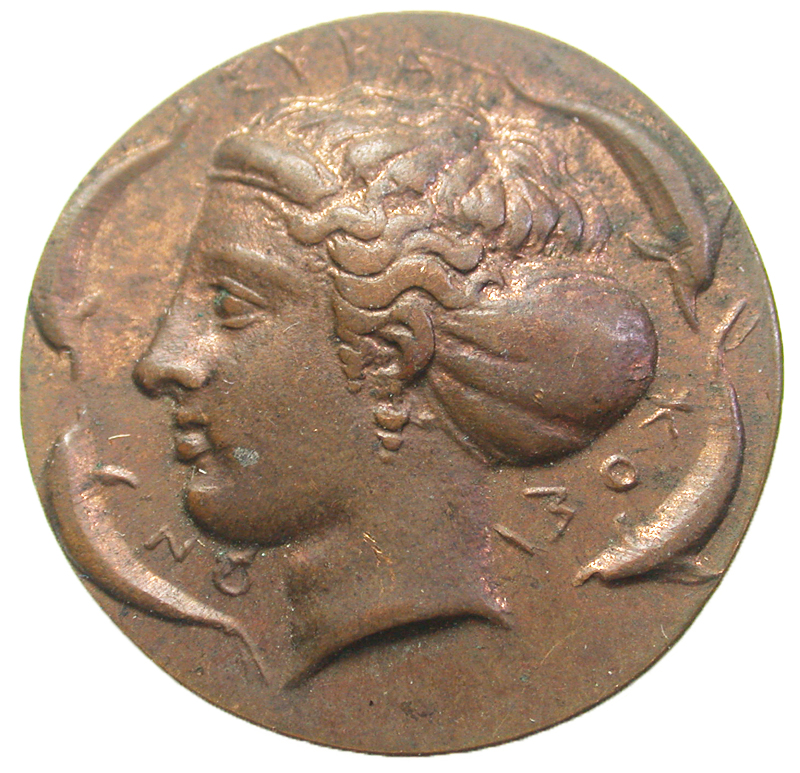 Sicily, Syracuse. Deinomenid Tyranny. 485-466 B.C. Copper tetradrachm (25.7 mm, 6.74 g). UNIFACE COPPER / ROSA OFF-METAL TRIAL STRIKE. Uniface / ΣYPAKΩΣIΩN, Diademed head of Arethusa left; four dolphins around. cf. BMC 158; CD-157v. EF.