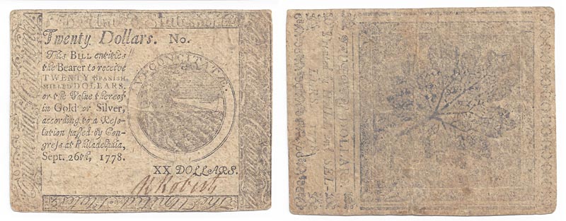 Continental Currency, $20, 1778. Twenty Dollar note, printed by Hall and Sellers, Sept. 26, 1778. The emblem on the front shows a strong wind creating waves, with the motto: "Vi concitatae" (It assults with a violent force). The nature print on the back is of buttercup. Paper contains blue threads and mica flakes. Lightly faded, no creases or stains. 3.5 x 2.75 inches.This example is lacking the serial number and first signature (lower left), both normally in red. It is possible that this note never actually circulated.