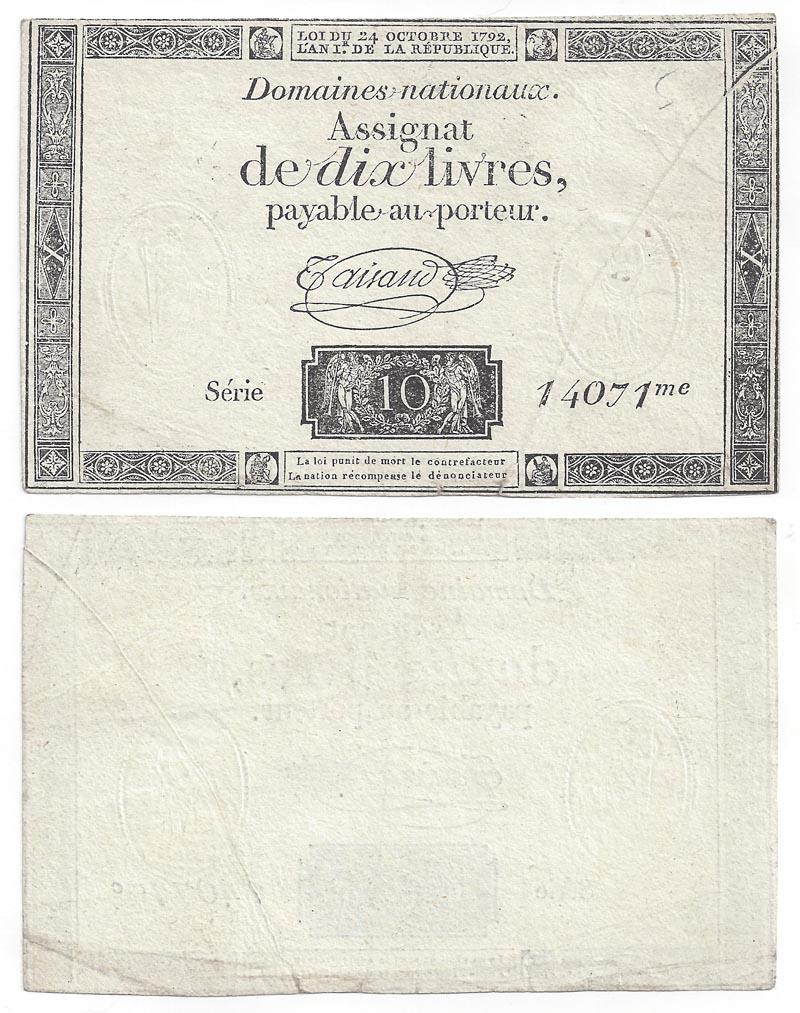 French 10 livres Note, 1792. Domaines nationaux. Assignat de dix libres, payable au porteur. Loi Du 24 Octubre1792. Serie 14071me. Nearly uncirculated, light crease. 4.5 x 2.75 inches.