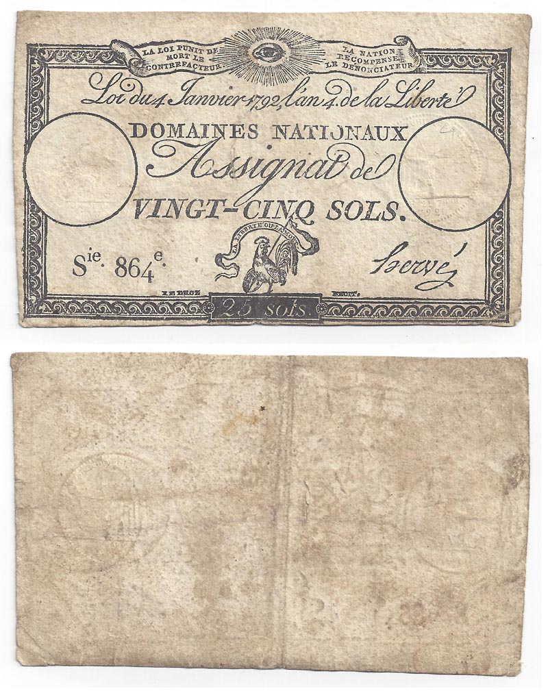 French 25 Sol Note, 1792. Domaines nationaux. Assignat vingt-cinq sols, payable au porteur. Loi Du 4 Janvier 1792. Serie 864e. Nearly uncirculated, light staining. 4 x 2.5 inches.