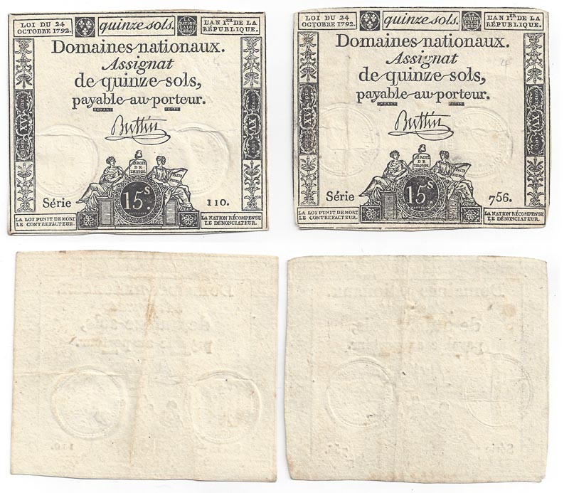 Lot of 2 French 15 Sol Notes, 1792. Domaines nationaux. Assignat de quinze sols, payable au porteur. Loi Du 24 Octubre 1792. Serie 110 and 756. Nearly uncirculated. 3 x 2.75 inches.