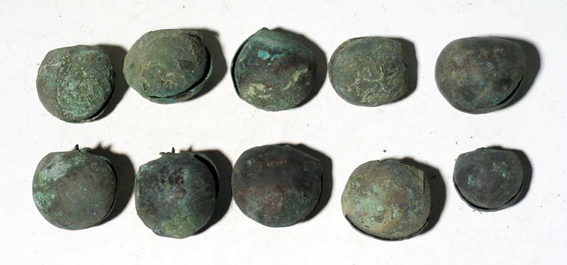 Moche Copper Bells. A group of 10 Moche copper bells from Peru, c. 300 – 700 AD. Most are about 1” in diameter, are in the form of clam shells and have functional clackers. Good mineral deposits and oxidation. Ex Llerena collection. Value range $330 - $450.