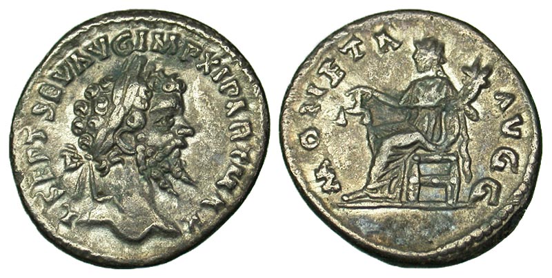 Septimius Severus. A.D. 193-211. AR denarius (17.5 mm, 2.47 g, 1 h). Laodicea ad Mar, A.D. 198-200. L SEPT SEV AVG IMP XI PART MAX, laureate head right / MONETA AVGG, Moneta seated left, holding scales and cornucopia. RIC 510a; RSC 342. VF.