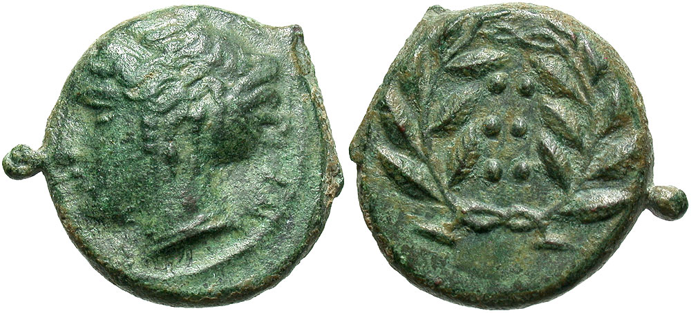 Sicily, Himera. Ca. 415-409 B.C. Æ hemilitron (15 mm, 3.23 g, 11 h). IM-E, head of nymph left, hair bound in sphendone; six pellets before / Six pellets within wreath. CNS 35; SNG ANS 186. gVF, nice green patina, sprues remaining. The sprues from the casting process of the flan are very distinct on this coin. It is not unusual at all to find sprues on Sicilian coins struck during this period, but ones so well pronounced, especially as is the case of the one on the left edge, are rather uncommon and makes this coin notable for illustrating one of the many techniques of ancient coin production.