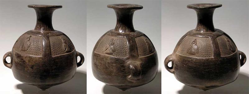 Inca Aribalo. A choice Inca Aribalo with avian theme from Peru, c. 1300 – 1500 AD. This highly burnished blackware vessel is 8” high and is decorated with four panels depicting birds in flight. A nicely detailed example of a classic type, intact, with good mineral deposits and trails. Ex Sarmiento collection. $450 - $600.