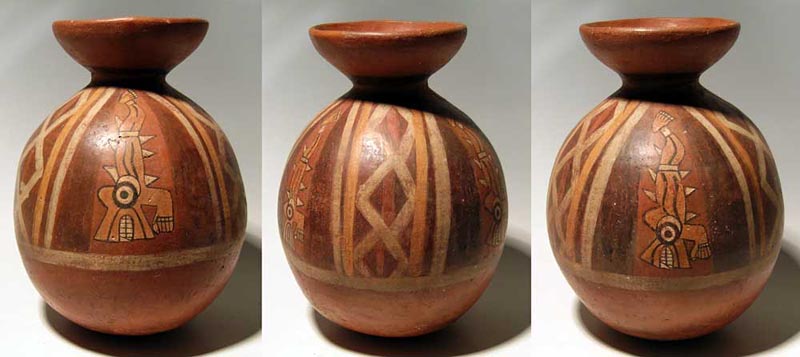 Huari Orca Vessel. A large Huari polychrome vessel from Peru, c. 650 – 800 AD. This beautifully painted Coastal Huari type example is 9-1/4” high and is decorated with a trio of superbly detailed Orca deities, separated by geometric and linear design panels. The orca design is an adaptation of earlier Nazca AMB paintings, showing the cross cultural influence of Nazca painters on Huari artisans. Intact, vivid paint, good mineral deposits. Ex Sarmiento collection. Value range $830 - $1000.
