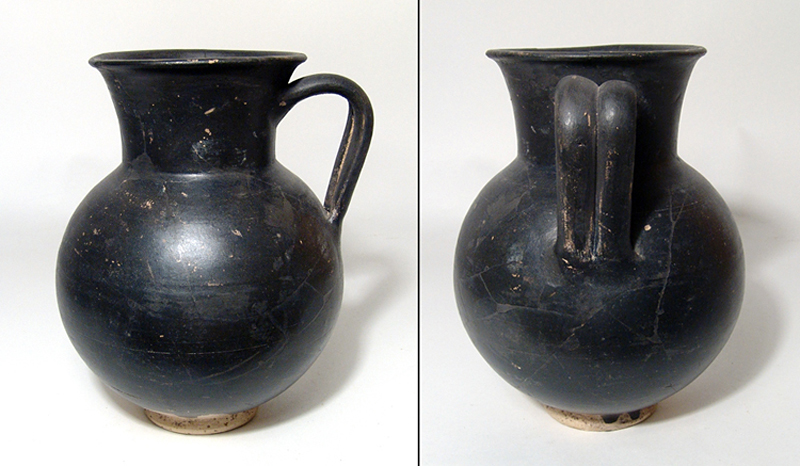 A Greek Black-wre Olpe. A large Greek black-ware olpe, c. 4th - 3rd Century BC, the rounded body on a flared foot, the mouth flared with curved rim and double-strap handle. H: 6 3/4" (17.1 cm). Professionally restored and quite attractive. Ex Orange County private collection. Value Range: $200 - $300.