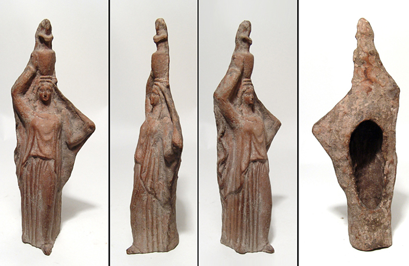 A Greek Terracotta Figure of a Woman. A Greek terracotta figure of a woman, c. 3rd - 2nd Century BC, wearing chiton and himation, her left hand supporting a vessel set atop her head, right hand holding open a fold of her garment. Pleasing style! H: 9” (22.8 cm). Intact with earthen deposits. Ex Los Angeles private collection. Value Range: $500 - $600 .