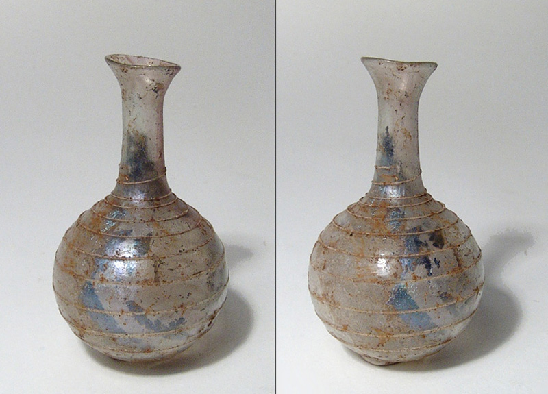 Purple Roman Glass Bottle. A pale purple Roman glass bottle with spiral threading, Eastern Mediterranean, 1st Century AD, the body round and neck thin and delicate, the mouth lightly flared. Around the body is a trailing of white glass over the light purple body. H: 2 ¾” (7 cm). Intact. Cf. Yale, p. 27, no. 74. Ex Los Angeles private collection. Value Range: $500 - $600.