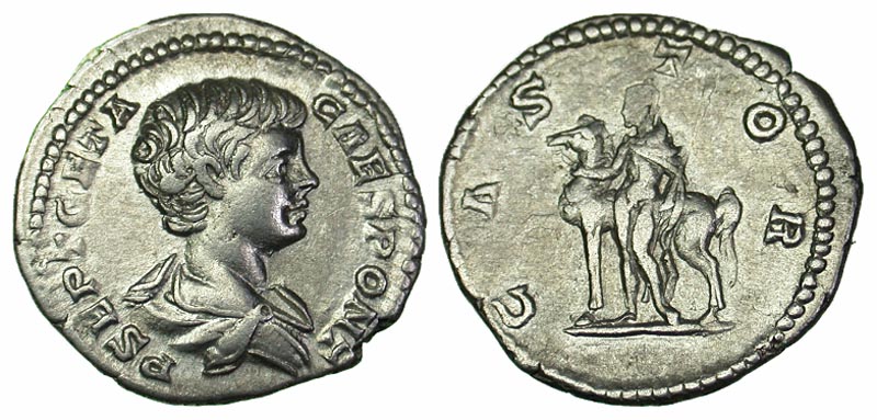 Geta. As Caesar, A.D. 198-209. AR denarius (18.7 mm, 3.13 g, 6 h). Rome, A.D. 199-204. P SEPT GETA CAES PONT, bare-headed and draped bust right, seen from behind / CASTOR, Castor standing left, holding scepter, in front of horse standing left. RIC 6; BMCRE 216; RSC 12. gVF.